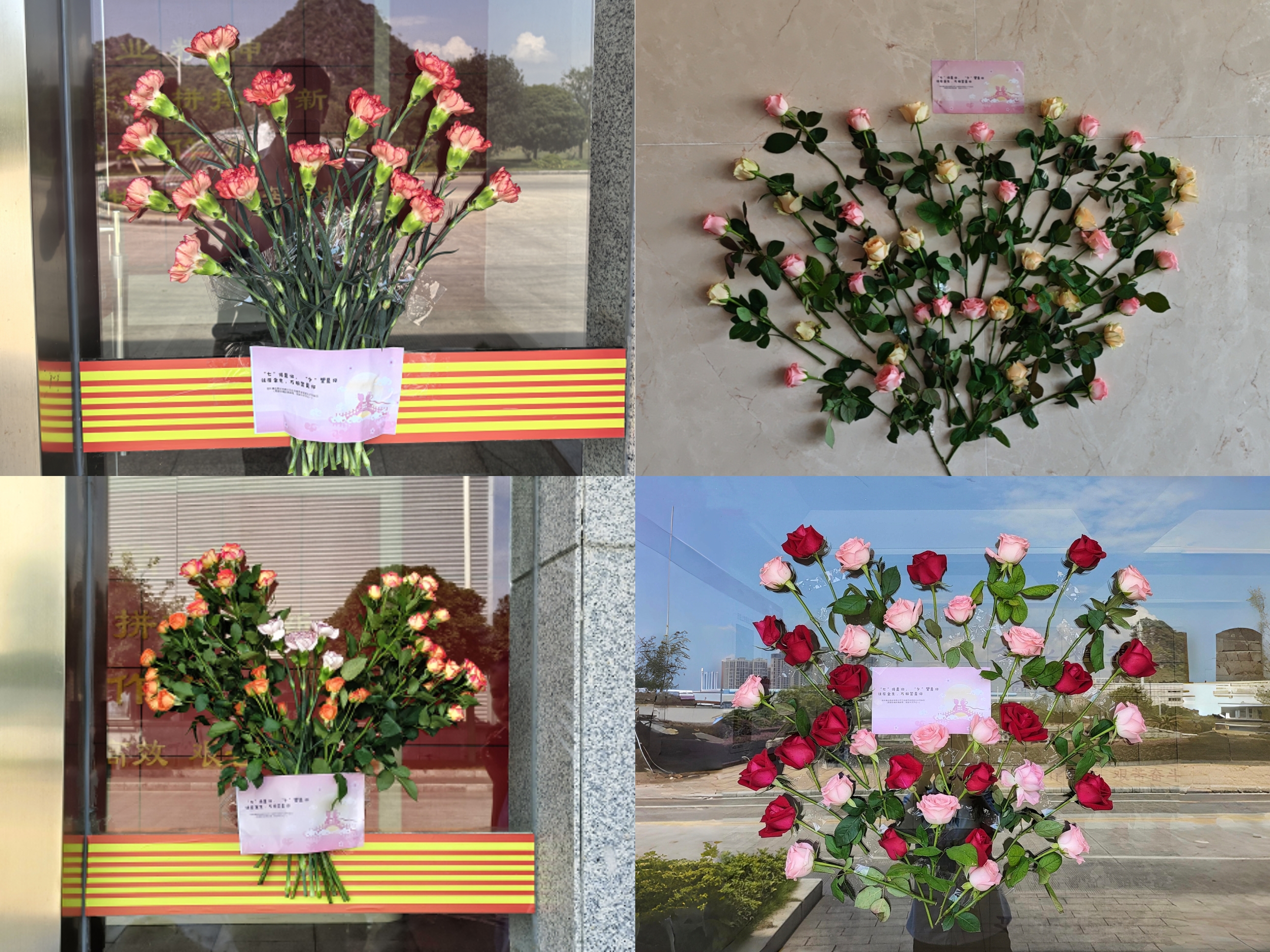 七夕清晨,公司工会早早组织工作人员在各办公楼的玻璃门上精心布置玫瑰花束——别出心裁地拼出树形、心形等多种生动造型。每一枝玫瑰花还附有温馨的祝福语,静静等候员工的到来。